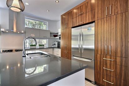 Le bois massif reste un grand classique pour sa chaleur et son caractère intemporel. Il apporte une authenticité incomparable, particulièrement appréciée dans les cuisines rustiques ou transitionnelles. Chaque essence — érable, chêne, noyer — possède son grain unique et sa propre teinte naturelle
