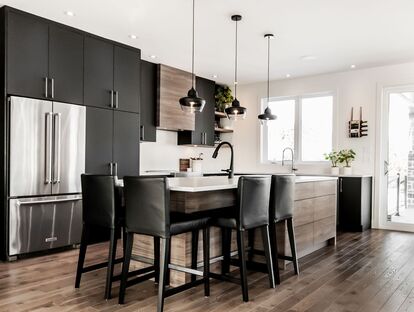 Les portes d’armoires ultra mates permettent à votre cuisine de s’intégrer plus facilement dans le design global de votre pièce, si vous souhaitez une cuisine ouverte. L’aspect mat de vos façades se fera alors plus discret et plus sobre que des armoires en MDF laqué ou des armoires super lustré, par exemple.